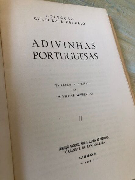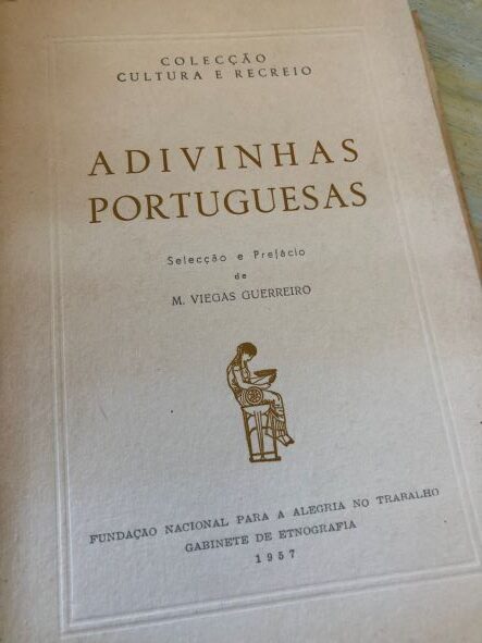 Selecção e Prefácio de ? Colecção Cultura e Recreio. Fundação Nacional para a Alegria no Trabalho. Gabinete de Etnografia. Lisboa. 1957. De 19,5×13,5 cm. com 213, [iii] págs. Brochado. Ilustrado no texto. Impressão muito nítida sobre papel de excelente qualidade. Exemplar por abrir, com leve acidez nas capas. Bom e útil trabalho sobre etnografia portuguesa, que recolhe 624 adivinhas, oriundas de várias regiões do país, tendo no final as respectivas soluções. Inclui bibliografia das obras donde foram extraídas as adivinhas com um código que permite identificar a origem de cada uma delas. Language: Português